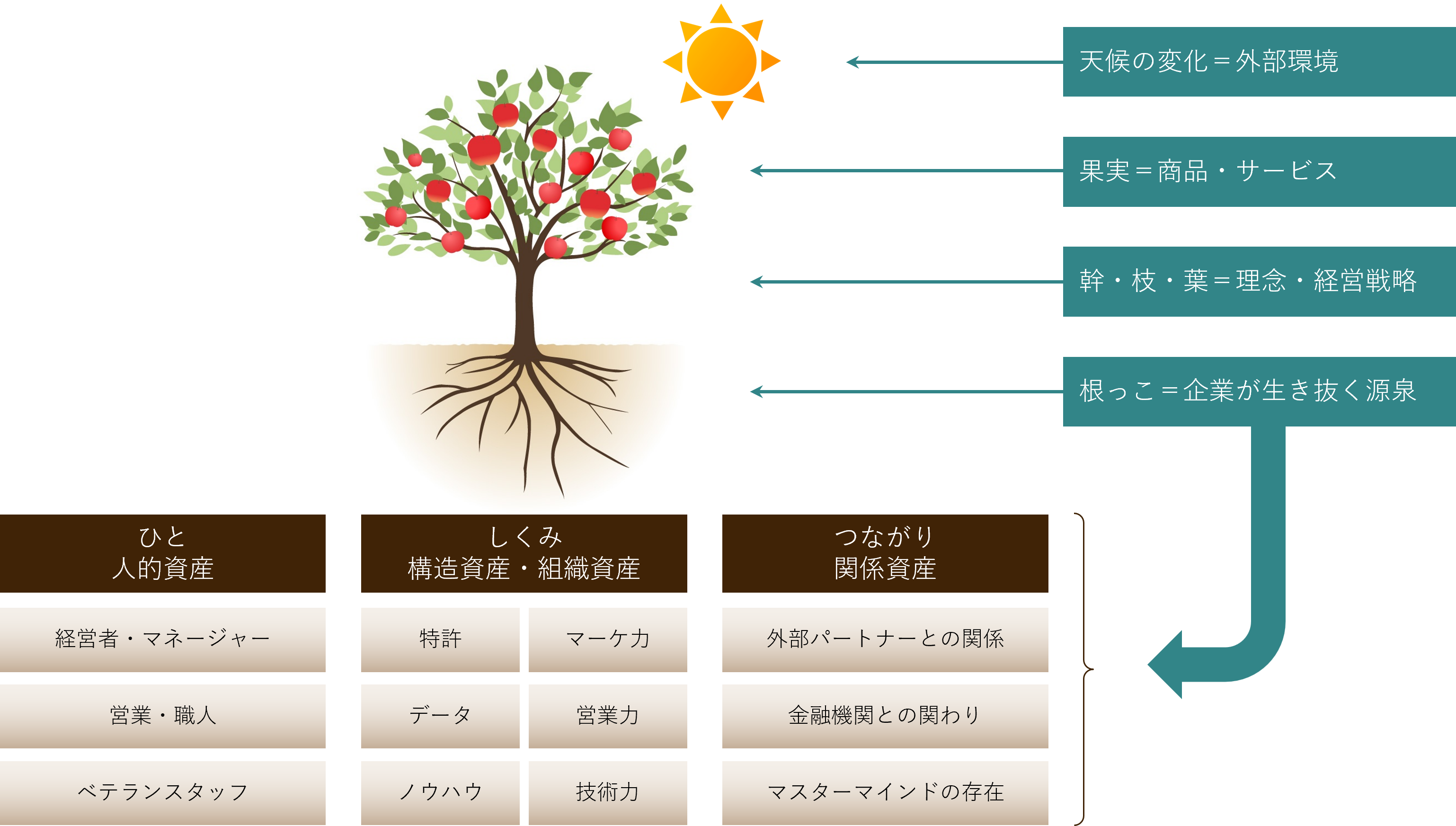 経営資源において、ヒト、モノ、カネ、情報とありますが、知的資産の考えでは「ひと」「しくみ」「つながり」となります。