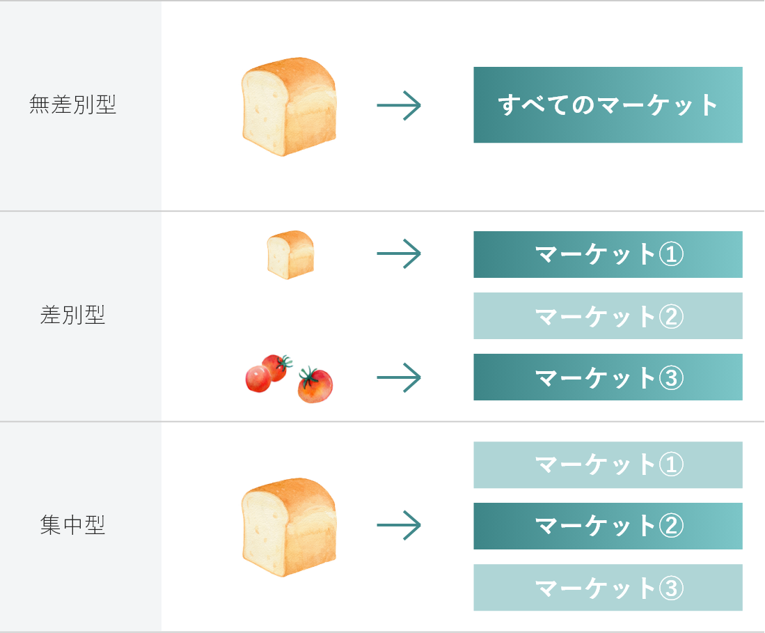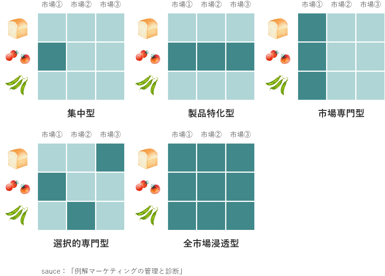 全市場を対象とする「全市場浸透型」、絞り込んだ市場を対象とする「単一セグメント集中型」「製品専門型」「市場専門型」「選択的専門型」の5つに分類して考えます。