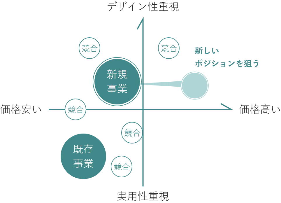 このとき、2軸の決め方がとても重要になります。とある2軸では競合と差別化できるポジションであったが、別の2軸で見てみると競合がひしめき合うポジションだった、なんてことが良くあります。