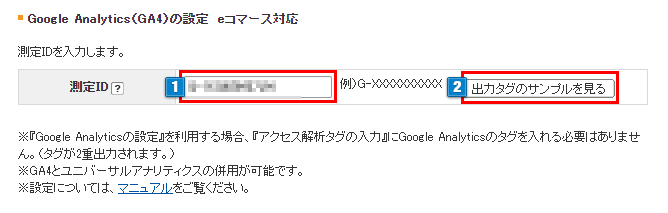 また、Google Analytics(GA4)では【G-】から始まる「測定ID」、Google Analytics(ユニバーサルアナリティクス)では【UA-】から始まる「ウェブプロパティID」を入力することで、各ツールでのeコマースサイト機能を含めて設定されます。