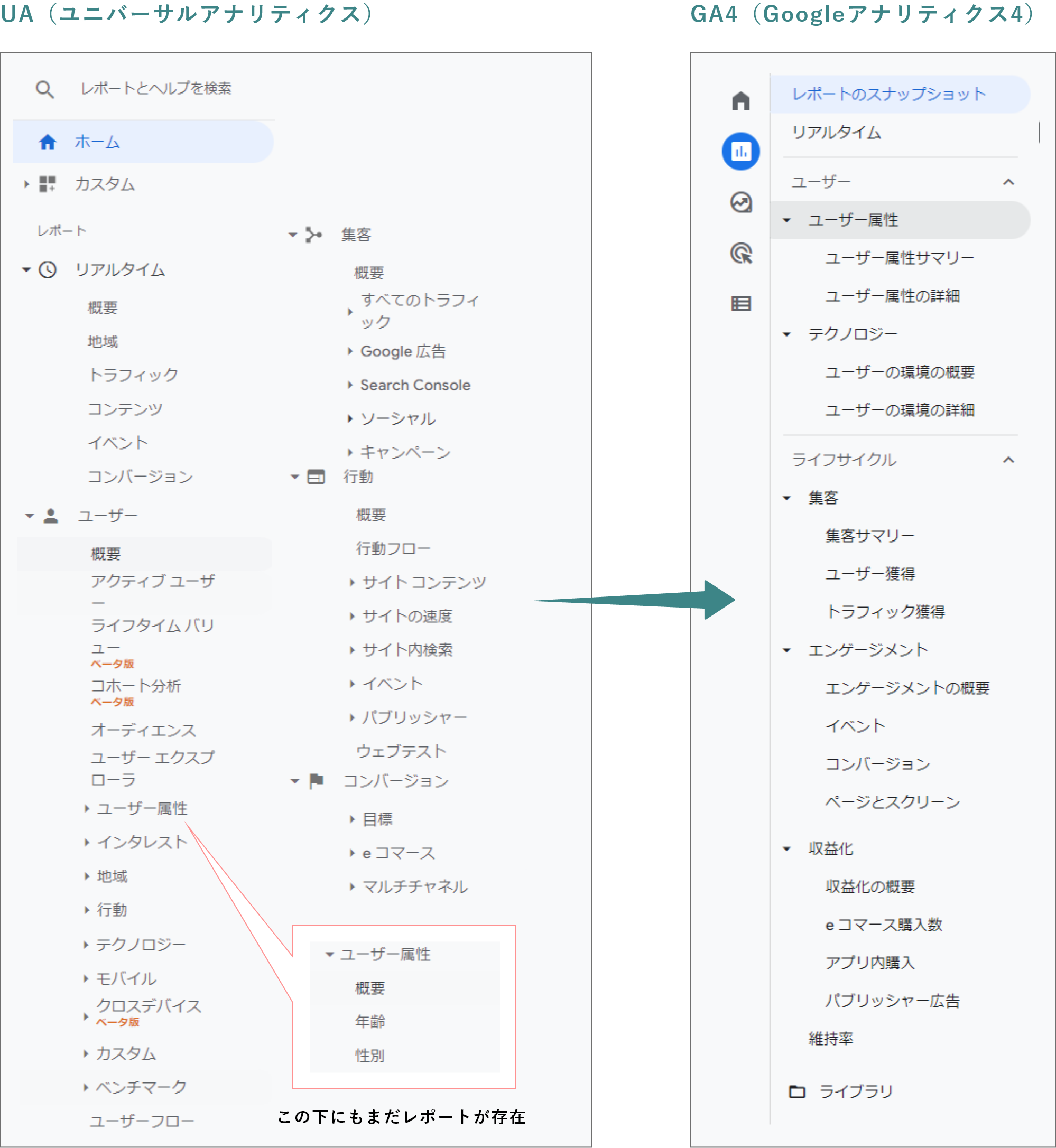 これまでのUA(ユニバーサルアナリティクス)は、13年以上経過した構造のため、150種類以上のレポートメニューが存在していました。