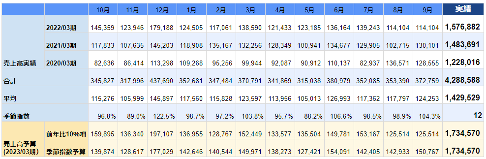 目標の売上予算は前年比10%増を目指しており、各月の目標予算は季節指数を加味しています。