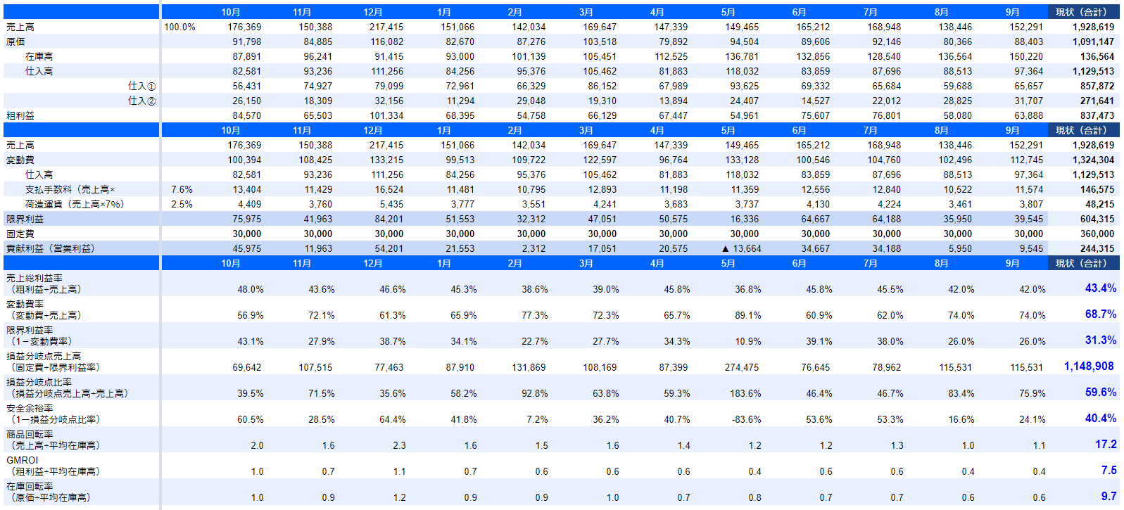 この表では、粗利益率に大きな変化はありませんが、変動費にばらつきがあります。その結果営業利益がマイナスになっている月もあるようです。