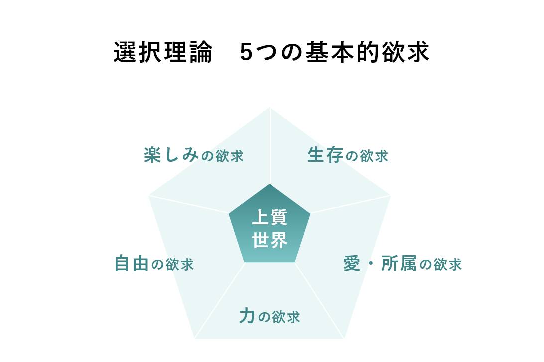 選択理論でも、人はそれぞれ満たすべき欲求を持っているとし、5つの欲求に分類されます。また私たちの行動はこれらの欲求を満たすために選択されているという考え方です。