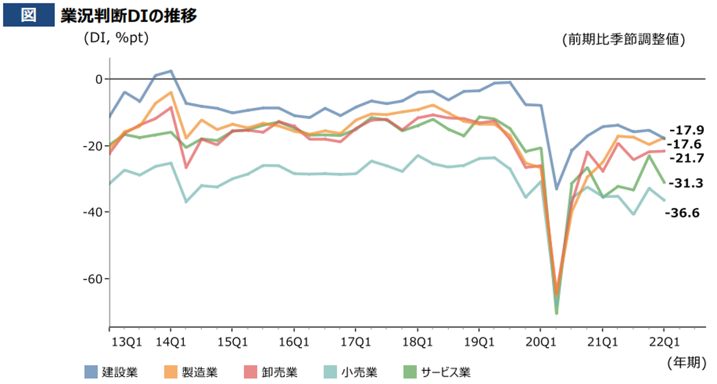 中小企業の業況判断DIは、2020年4-6月期にリーマンショック時を下回る水準まで急激に悪化。