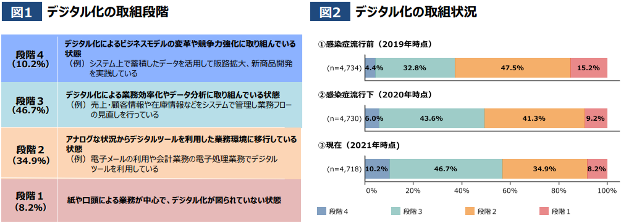 感染症の流行前後で、デジタル化により業務効率化などに取り組む事業者(段階3)は増加している。