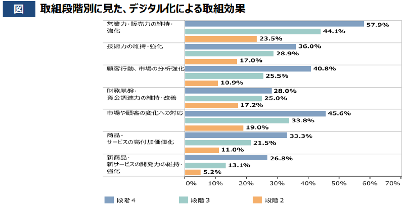 取組段階が進展するにつれて、営業力・販売力の維持・強化をはじめとする個々の効果を実感する事業者の割合は高くなる。 引き続き、デジタル化の進展に取り組み、最終的には新たなビジネスモデルの確立につながる段階への到達を目指すことが重要。