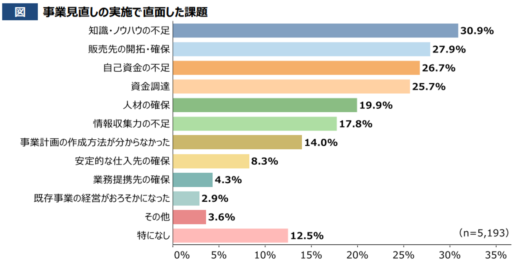 小規模事業者は、事業見直しに取り組むにあたって、知識・ノウハウの不足や販売先の開拓・確保、資金調達、