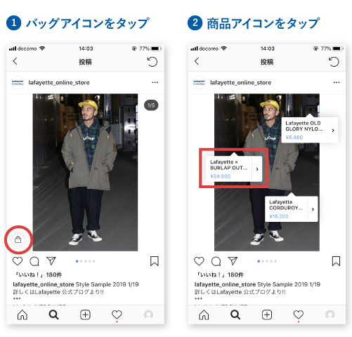 Instagramのフィード投稿時に商品情報をタグ付けすることで、ユーザーは投稿に表示された商品情報から商品ページへ遷移して商品購入をおこなえます。