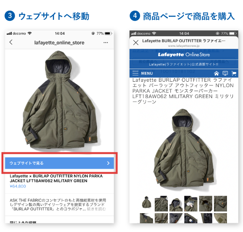 Instagramに投稿された商品情報から商品ページへ直接遷移することができ、また商品ページから購入することができるため商品の認知から購入までをシームレスにつなげることが可能になります。