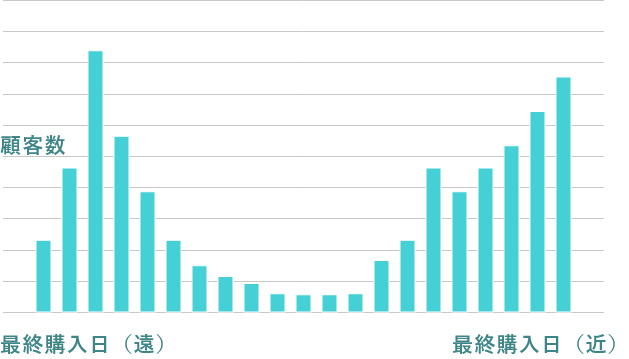 このとき「最終購入日」「購入頻度」「購入金額」それぞれの分布状況をヒストグラムで確認しましょう。