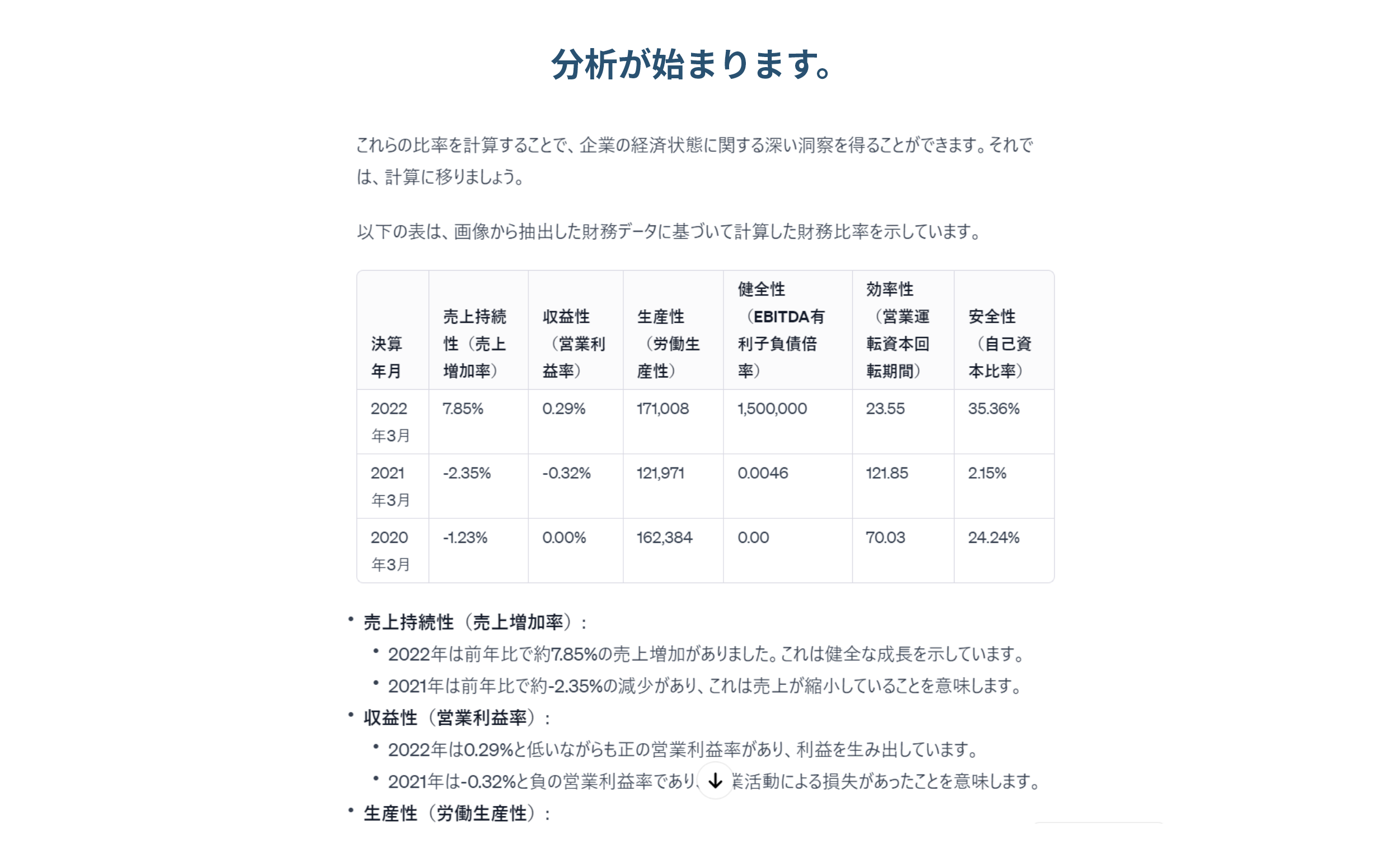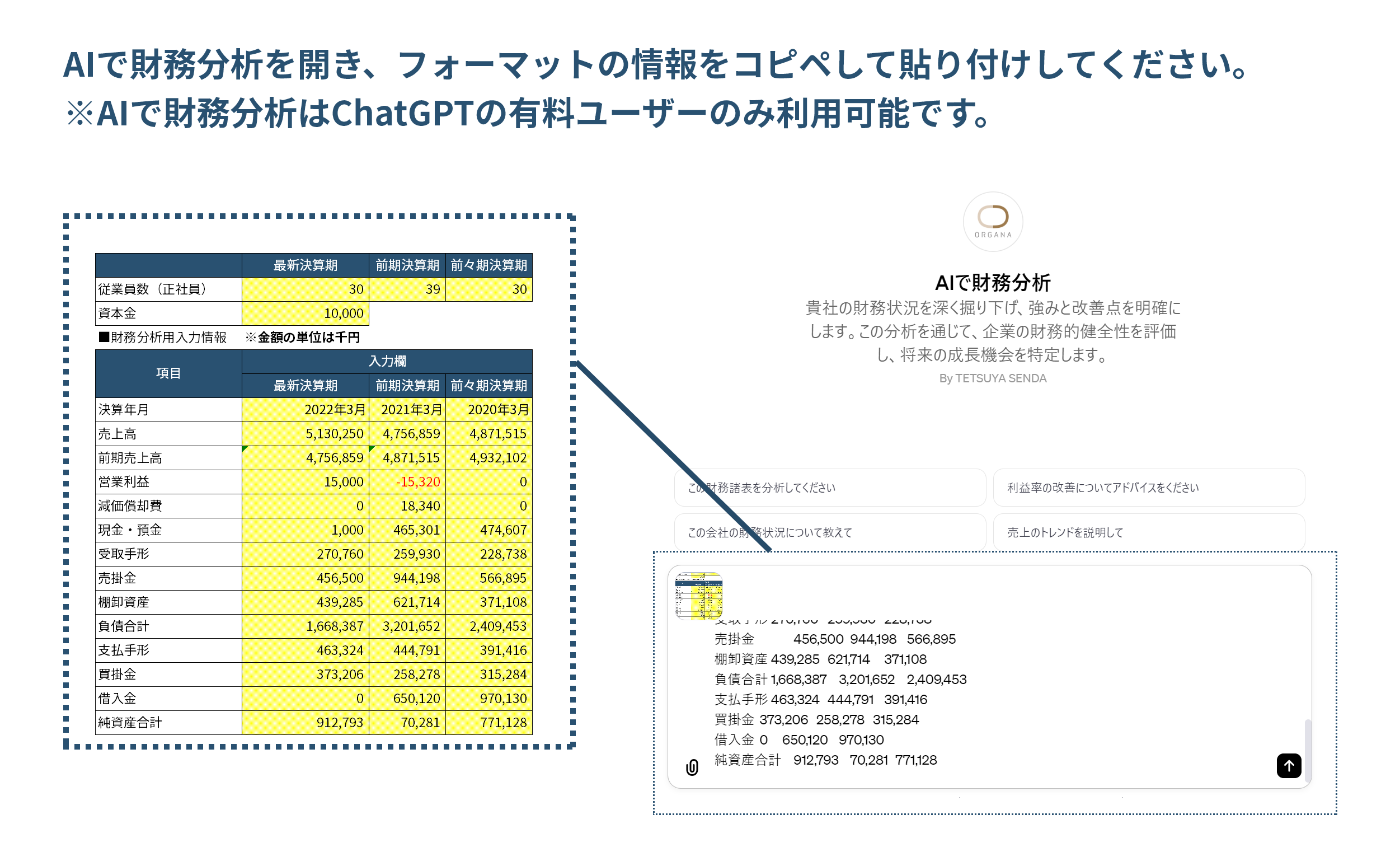 株式会社オルガナは、「AIで財務分析」というChatGPTを使った財務分析ツールを提供しています。このツールは、以下の重要な財務指標を自動計算し、経営者が直面する財務分析の課題を解決します。