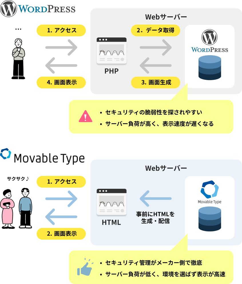 ・アクセス負荷に強い ・表示速度が速く非常にセキュア ・メーカーサポートが受けられる ・脆弱性が生じにくい |