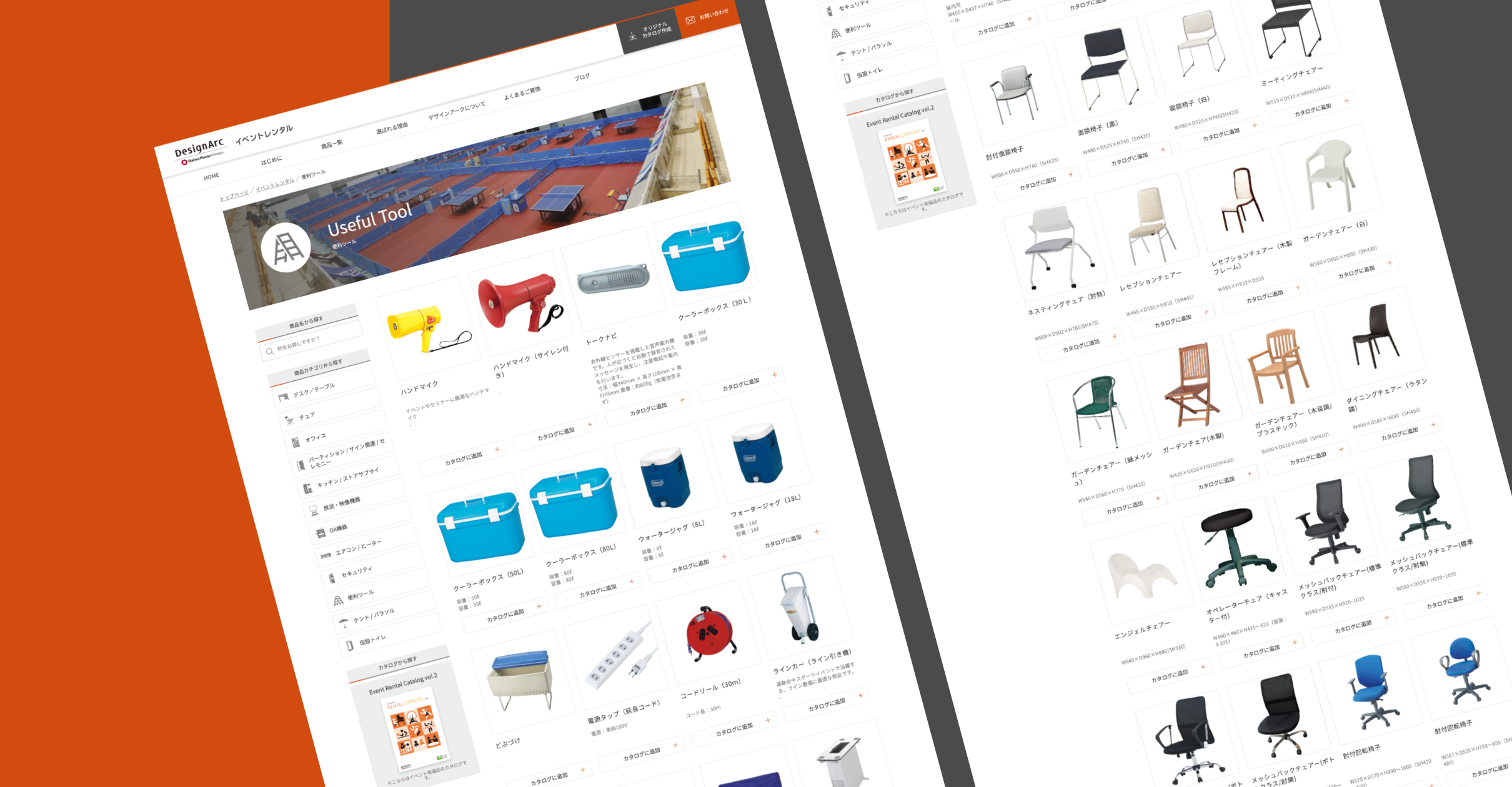 今回のリニューアルで特に注力したのが、「オリジナルカタログ作成機能」です。ユーザーが「テント/椅子/テーブル」などの商品カテゴリーから必要な備品を選び、「カタログに追加」ボタンで一覧化。その後、自社仕様に数量を編集したり、順番を入れ替えたり削除を行ったりでき、最後に「オリジナルカタログを印刷(PDFダウンロード)する」ボタンでPDF化できる仕組みです。